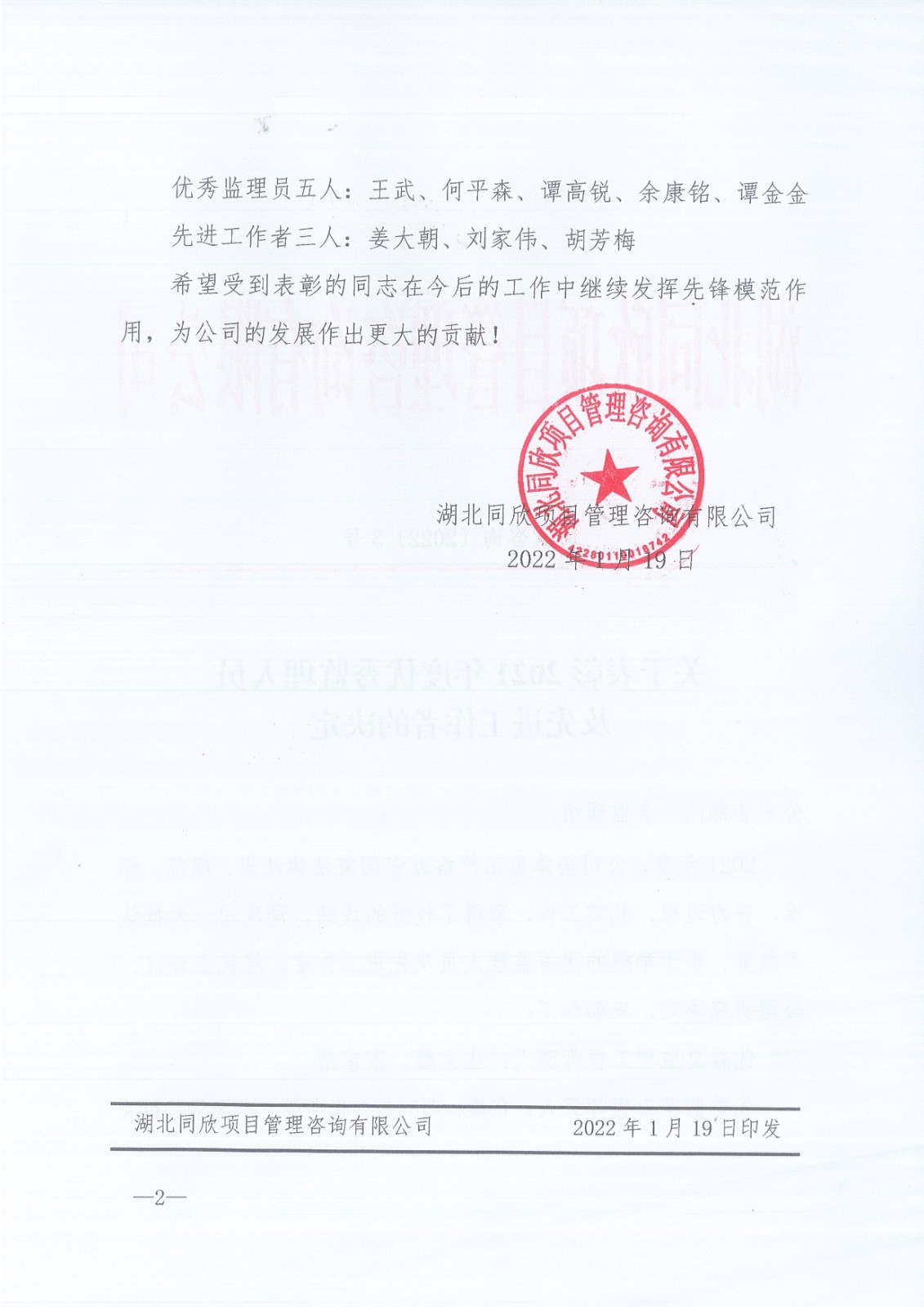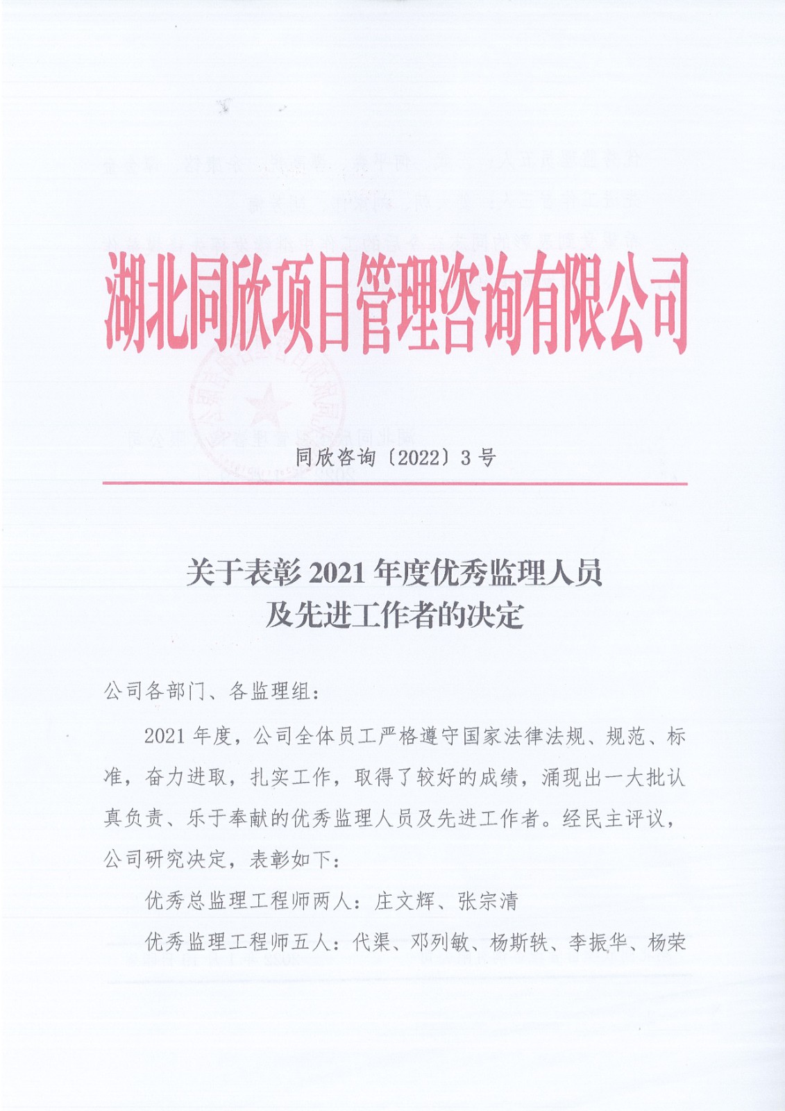 关于表扬2021年度优异监理职员及先进事情者的决议