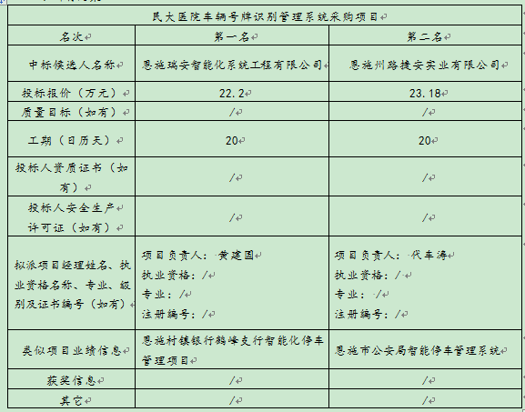 民大医院车辆号牌识别治理系统采购项目于 2015年3月20日至2015年3月26日在恩施州公共资源生意中心 宣布招标通告,,,,,因第一次招标失败,,,,,于 2015年4月20日至2015年4月24日在恩施州公共资源生意中心 宣布第二次招标通告,,,,,2015年 5月 12日在恩施州公共资源生意中心开标大厅(恩施市施州大道58号邮政局四楼)开标,,,,,并于 2015年 5月 12日完成评标事情。。。凭证评标委员会提交的评标报告,,,,,湖北民族学院隶属民大医院已经确认评标效果,,,,,现举行评标效果公示。。。