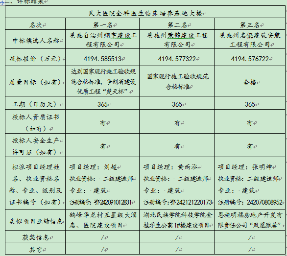民大医院全科医生临床作育基地大楼于 2015 年11月13日至2015 年11月18日在恩施州公共资源生意中心 宣布招标通告,,2016年1月 5日在恩施州公共资源生意中心开标大厅(恩施市施州大道58号邮政局四楼)开标,,并于 2016年 1月 5日完成评标事情 。。。凭证评标委员会提交的评标报告,,湖北民族学院隶属民大医院已经确认评标效果,,现举行评标效果公示 。。。